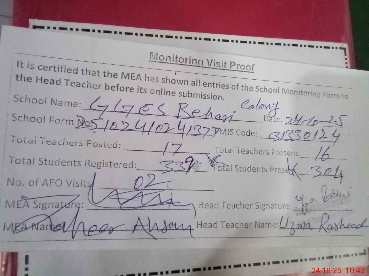 | Certified that this School was Inspected by the Undersigned MEA/DMO Today and the Information Stated Above is as Per Record. | |||||