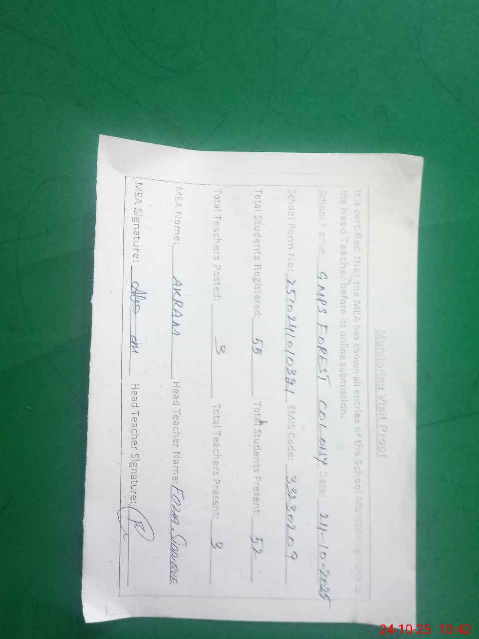 | Attendance Register | Head Teacher | MEA with School | Visit Proof |
