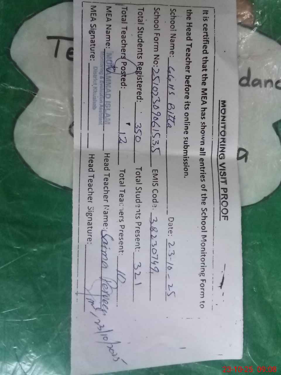 | Attendance Register | Head Teacher | MEA with School | Visit Proof |
