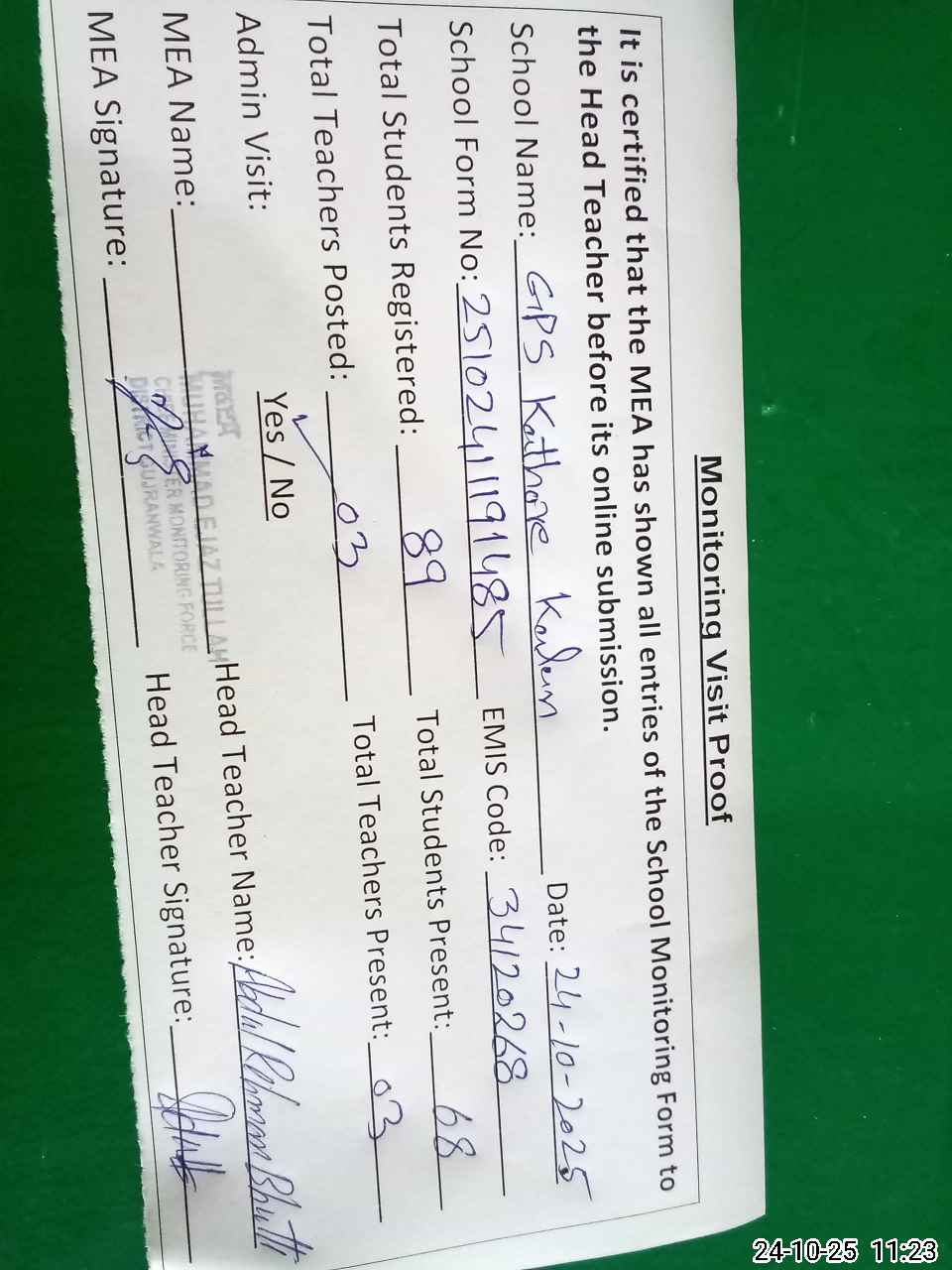 | Attendance Register | Head Teacher | MEA with School | Visit Proof |