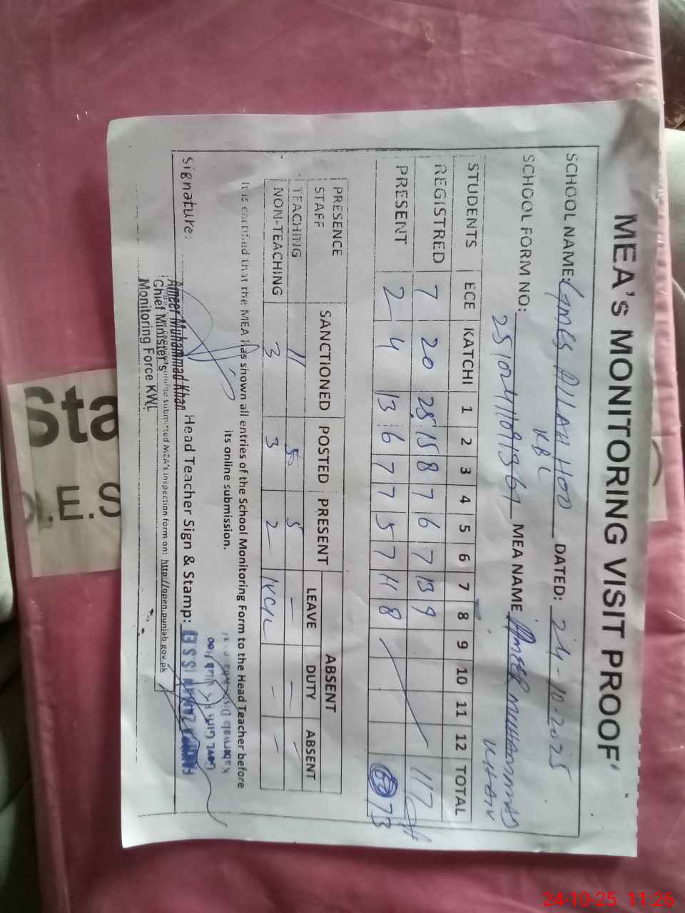 | Attendance Register | Head Teacher | MEA with School | Visit Proof |