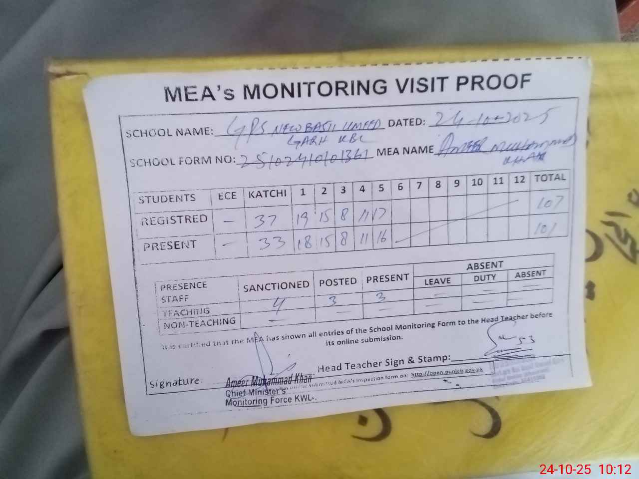| Certified that this School was Inspected by the Undersigned MEA/DMO Today and the Information Stated Above is as Per Record. | |||||