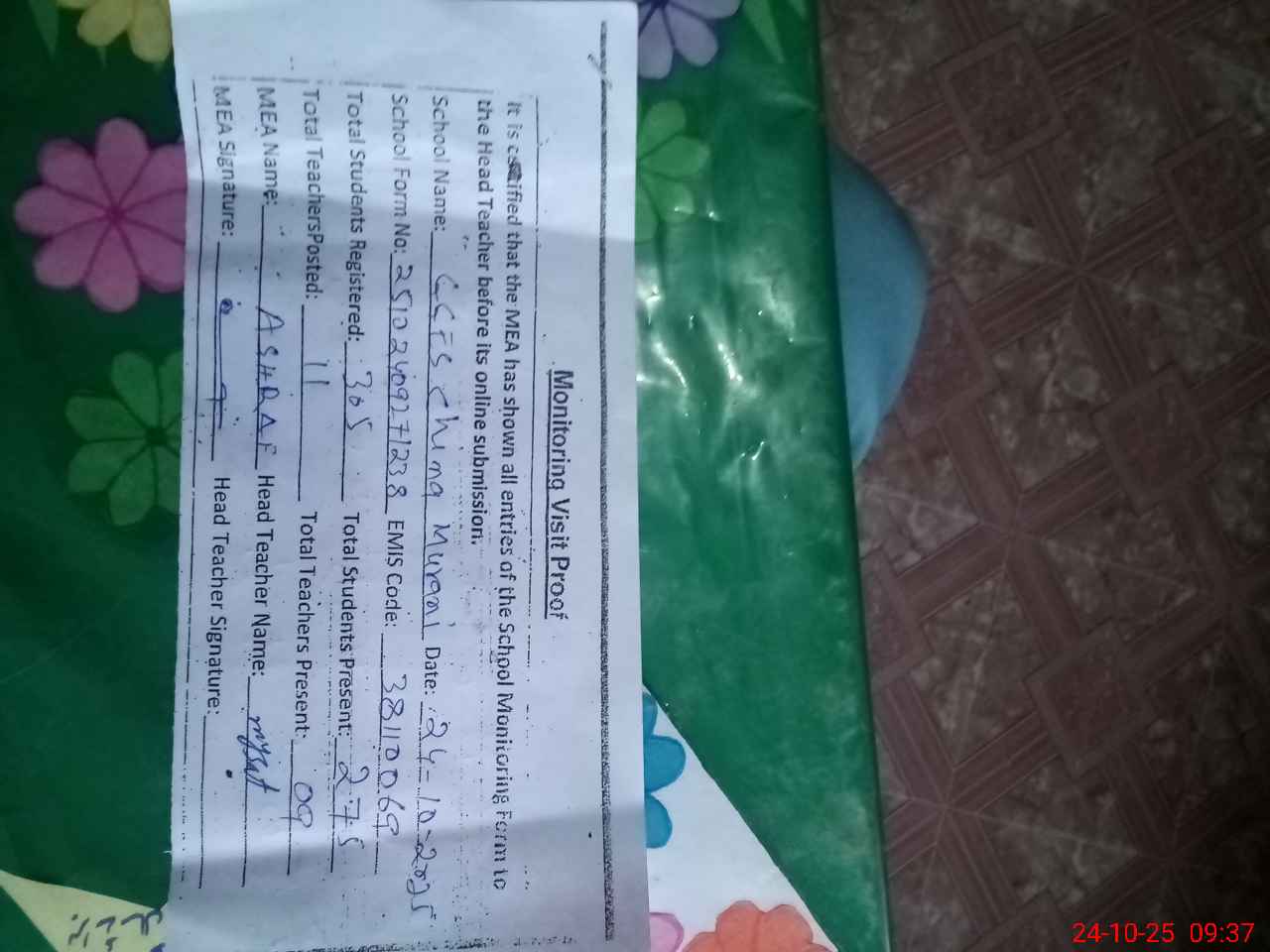 | Attendance Register | Head Teacher | MEA with School | Visit Proof |