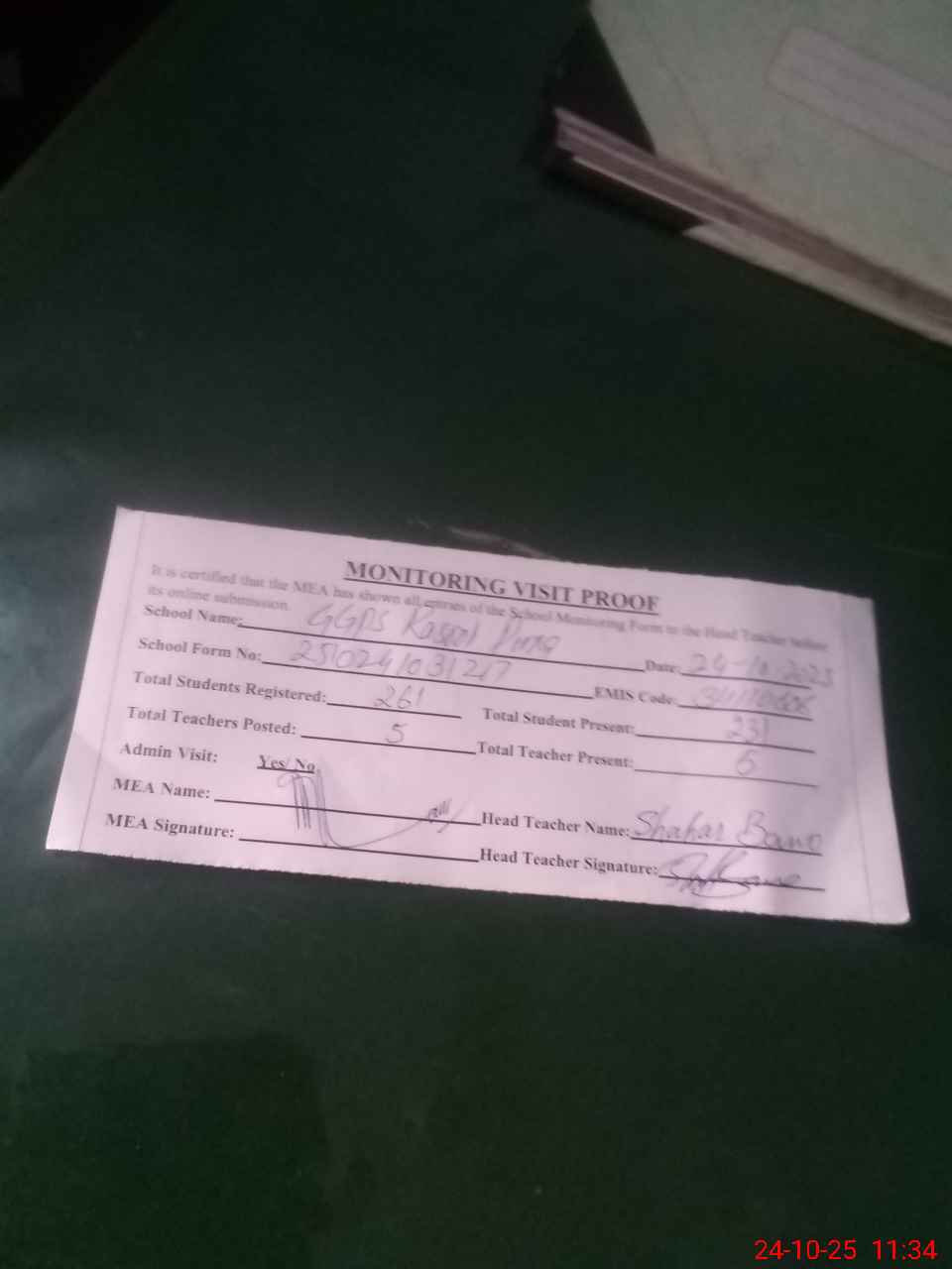| Attendance Register | Head Teacher | MEA with School | Visit Proof |