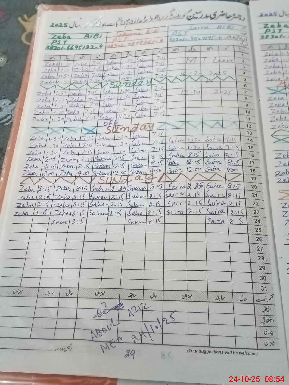 | Leave | Duty | Absent | Maternity | Medical | Ex- Pak |
