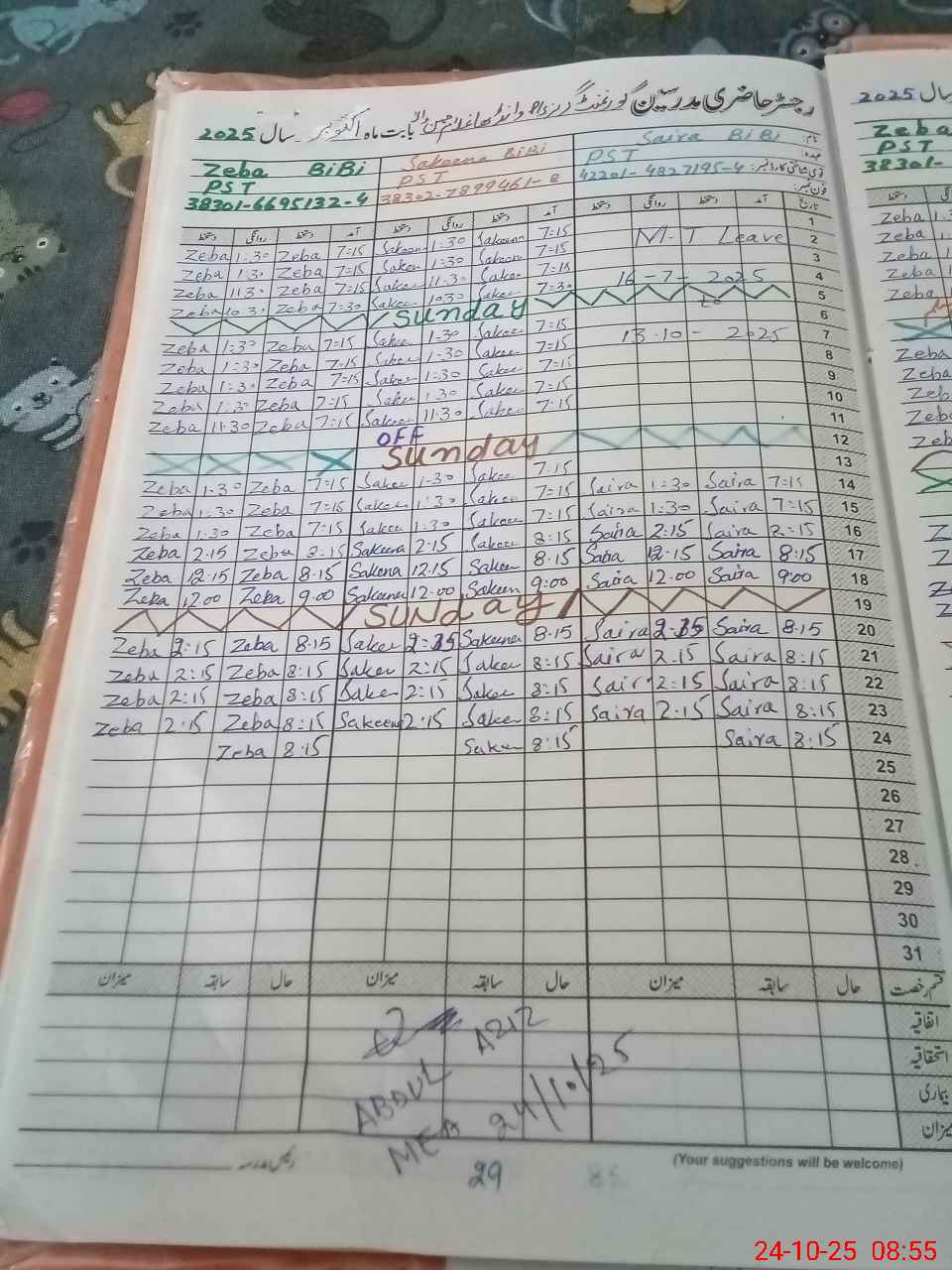 | CNIC | Full Name | Designation | R/C | Absence During Last Calender Month |