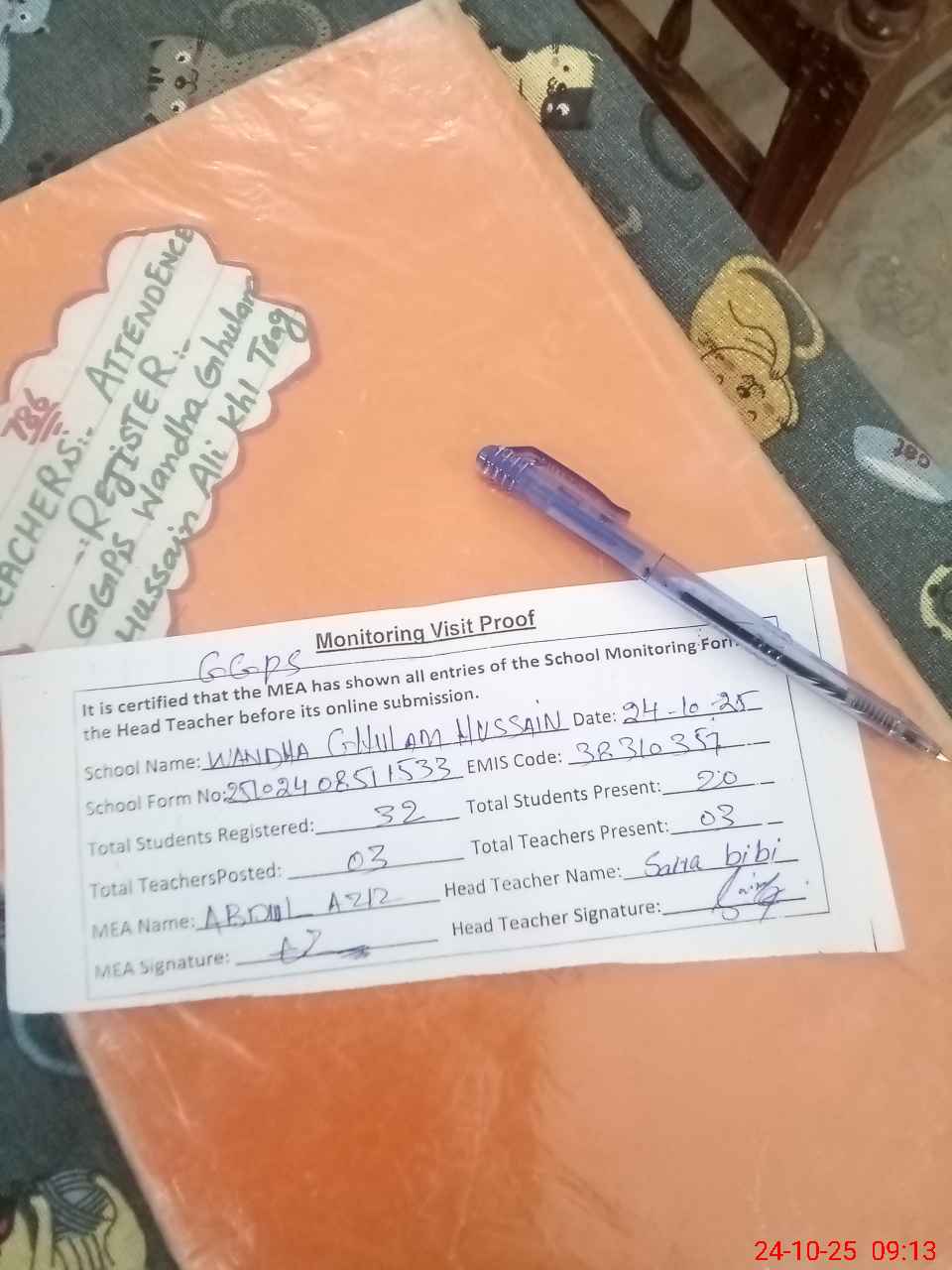 | Attendance Register | Head Teacher | MEA with School | Visit Proof |