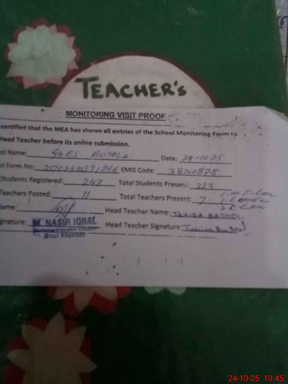 | Certified that this School was Inspected by the Undersigned MEA/DMO Today and the Information Stated Above is as Per Record. | |||||
