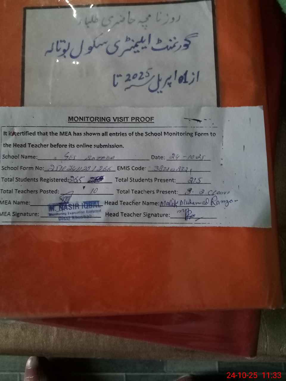 | Certified that this School was Inspected by the Undersigned MEA/DMO Today and the Information Stated Above is as Per Record. | |||||