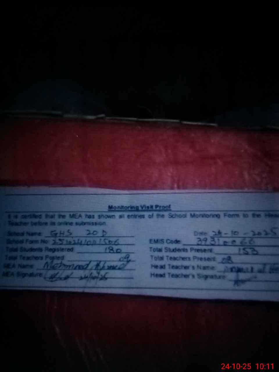 | Attendance Register | Head Teacher | MEA with School | Visit Proof |