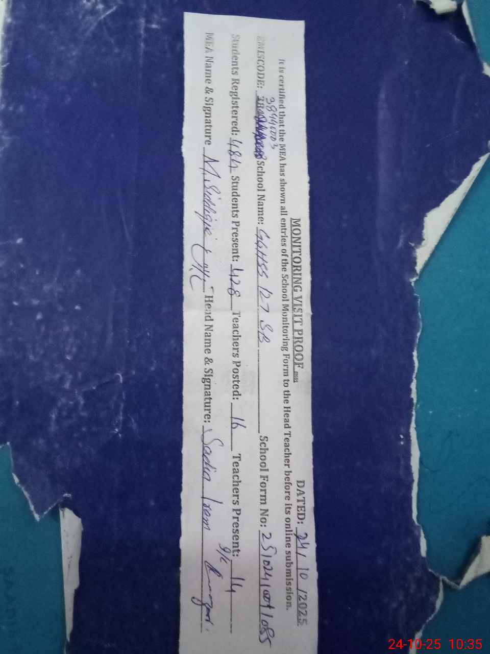 | Certified that this School was Inspected by the Undersigned MEA/DMO Today and the Information Stated Above is as Per Record. | |||||