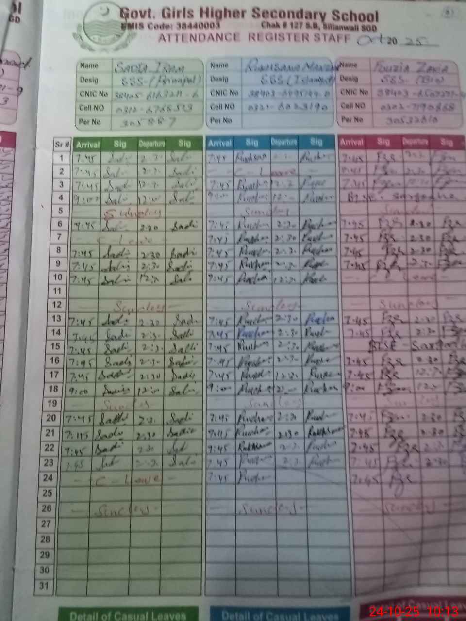 | CNIC | Full Name | Designation | R/C | Absence during last cal. month |