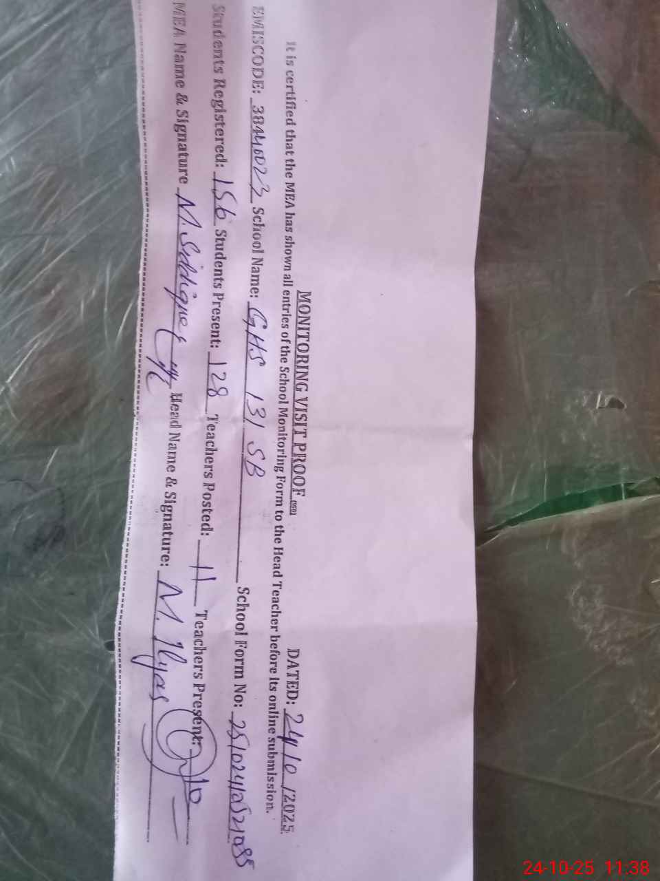 | Certified that this School was Inspected by the Undersigned MEA/DMO Today and the Information Stated Above is as Per Record. | |||||