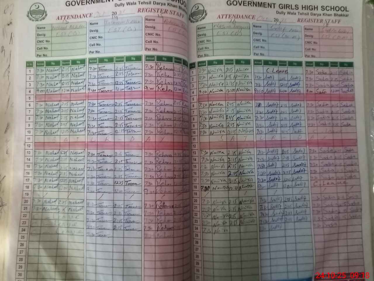 | CNIC | Full Name | Designation | R/C | Absence During Last Calender Month |