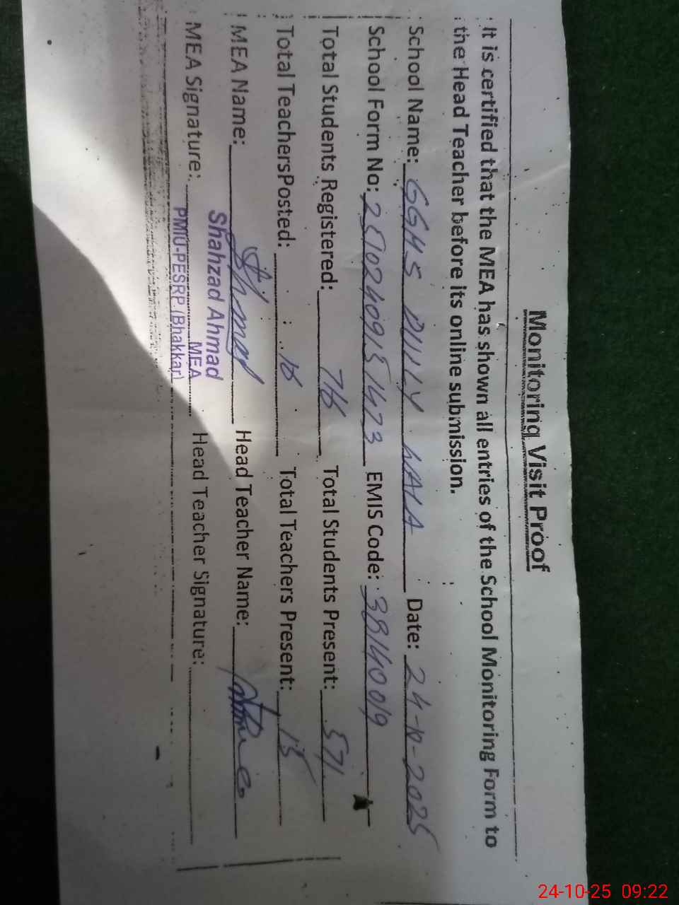 | Certified that this School was Inspected by the Undersigned MEA/DMO Today and the Information Stated Above is as Per Record. | |||||