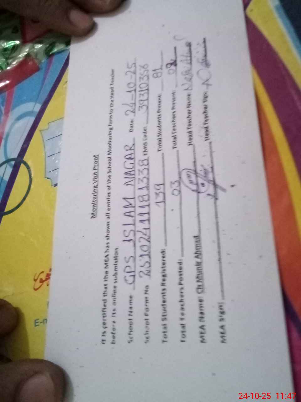 | Attendance Register | Head Teacher | MEA with School | Visit Proof |