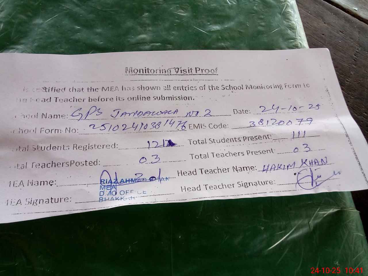 | Attendance Register | Head Teacher | MEA with School | Visit Proof |