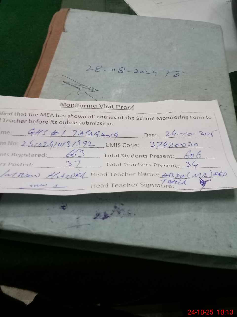 | Certified that this School was Inspected by the Undersigned MEA/DMO Today and the Information Stated Above is as Per Record. | |||||