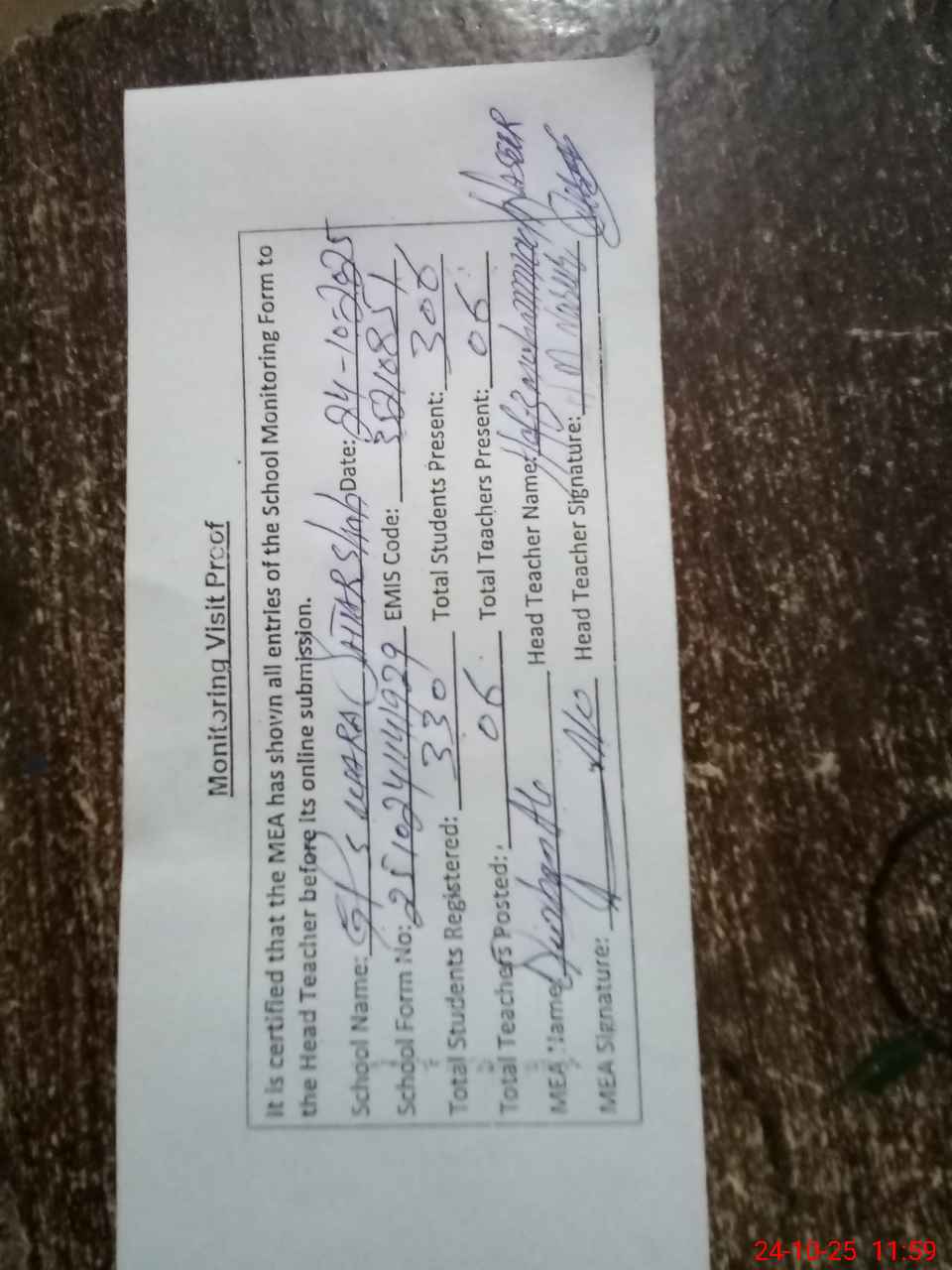 | Attendance Register | Head Teacher | MEA with School | Visit Proof |