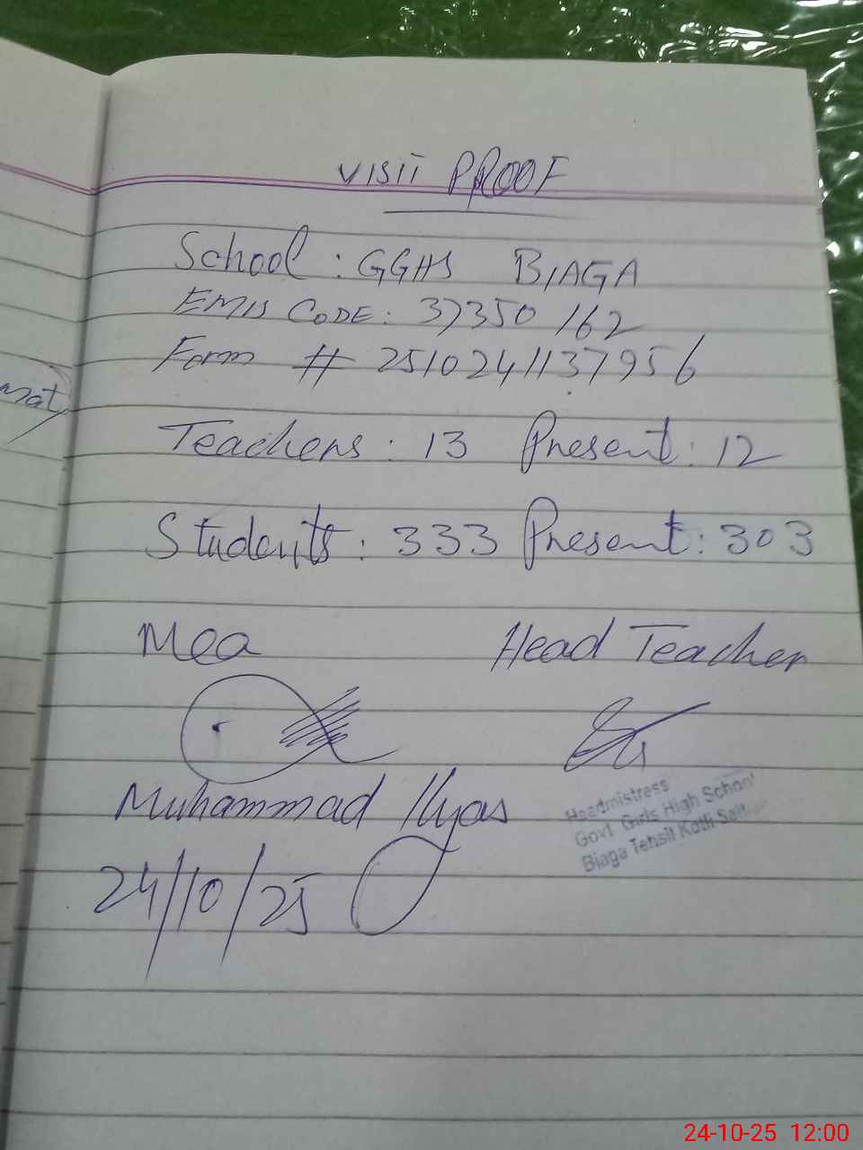 | Attendance Register | Head Teacher | MEA with School | Visit Proof |
