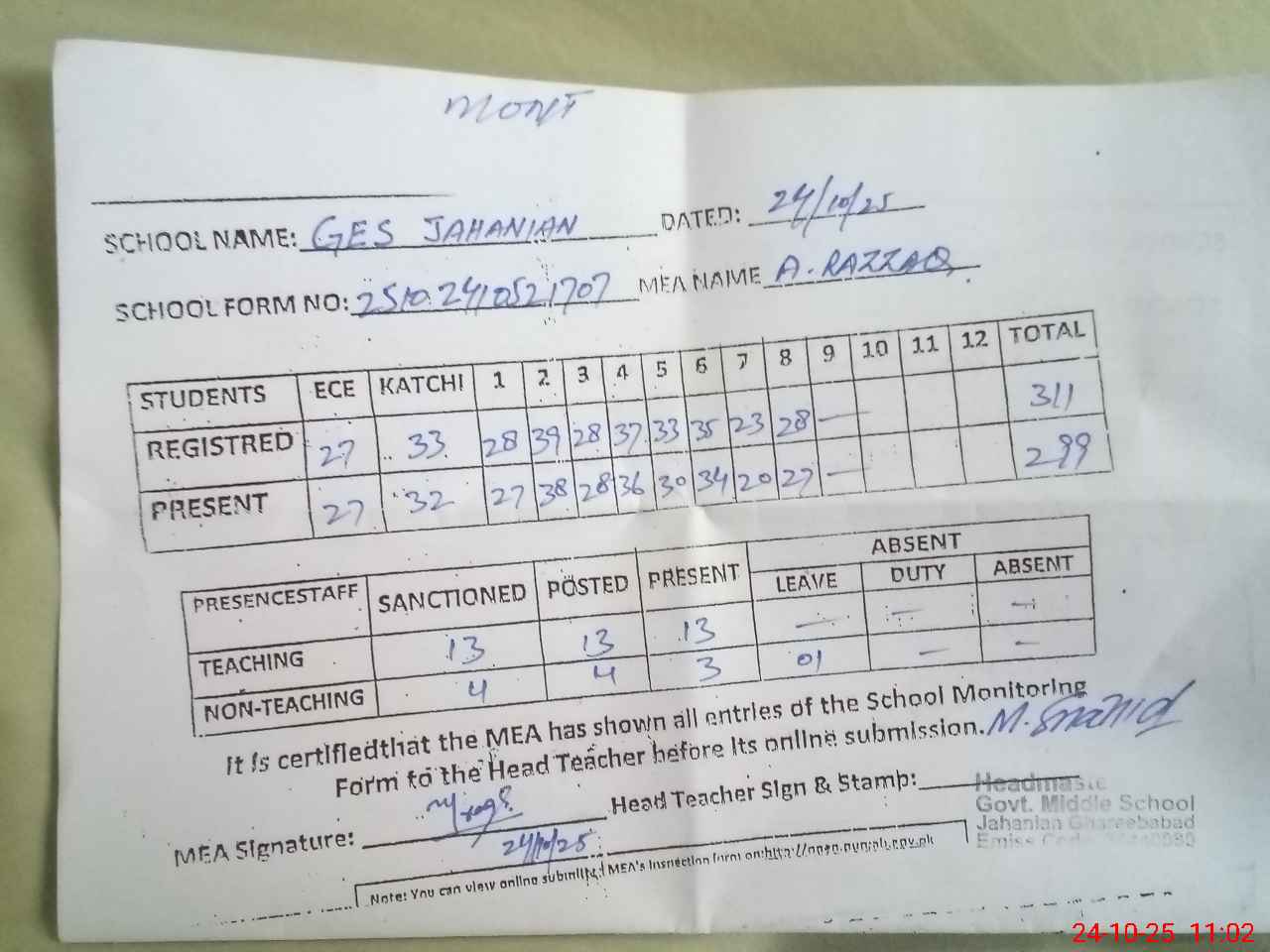| Attendance Register | Head Teacher | MEA with School | Visit Proof |