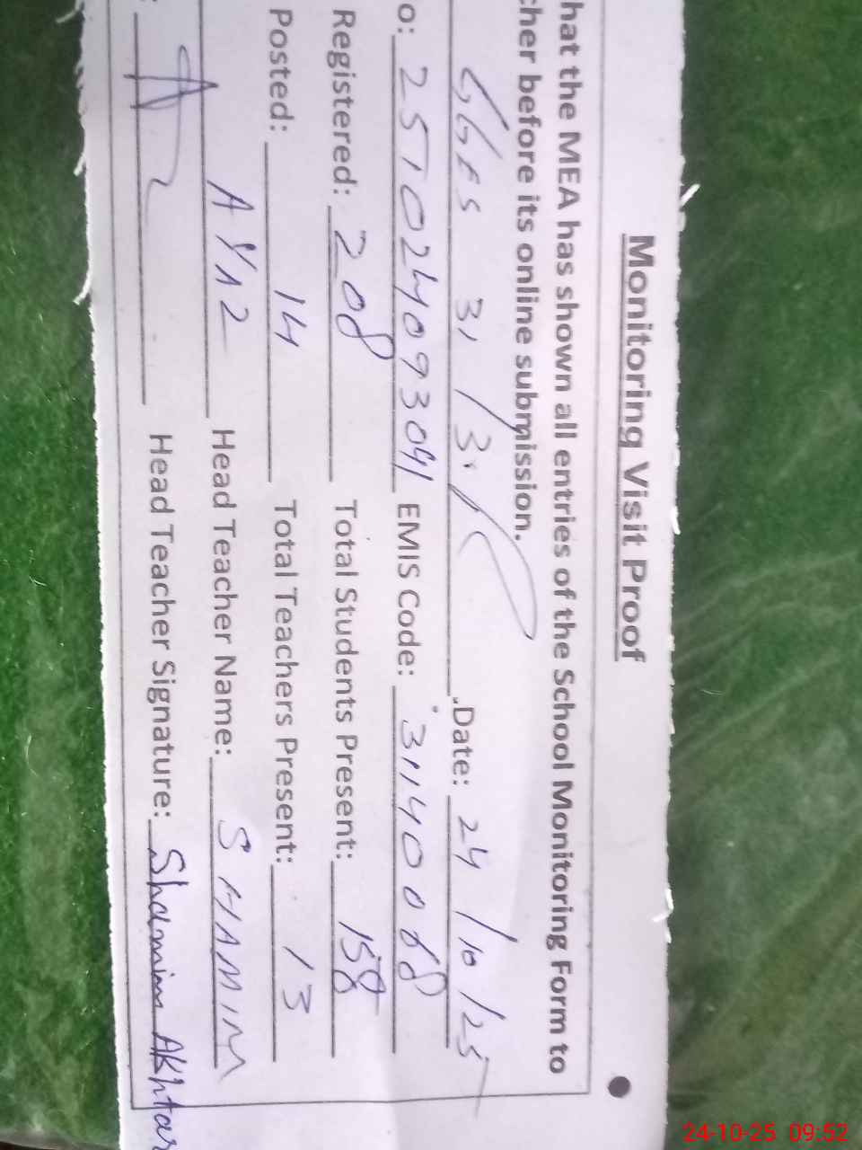 | Attendance Register | Head Teacher | MEA with School | Visit Proof |