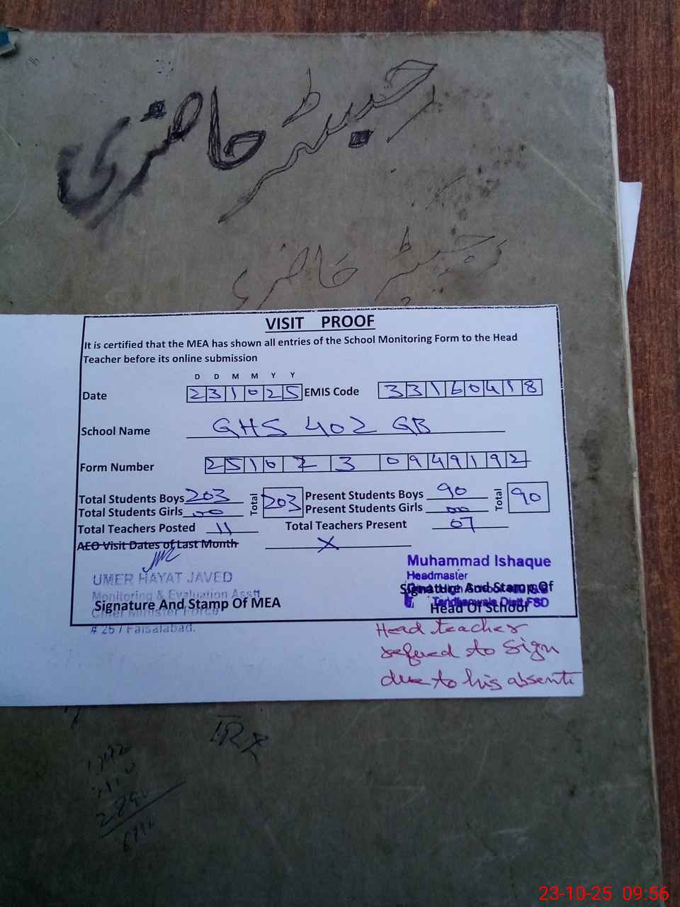 | EMIS Code: 33160418 | Name of School: GHS CHAK NO. 402/GB TANDLIANWALA | |||