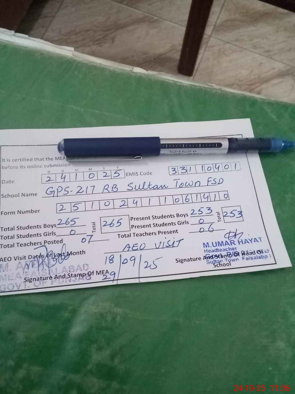 | Certified that this School was Inspected by the Undersigned MEA/DMO Today and the Information Stated Above is as Per Record. | |||||