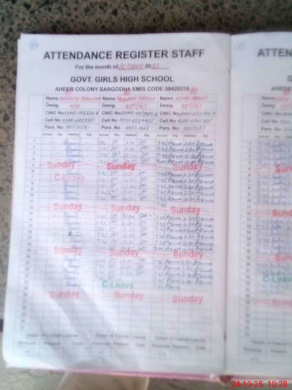 | CNIC | Full Name | Designation | R/C | Absence during last cal. month |
