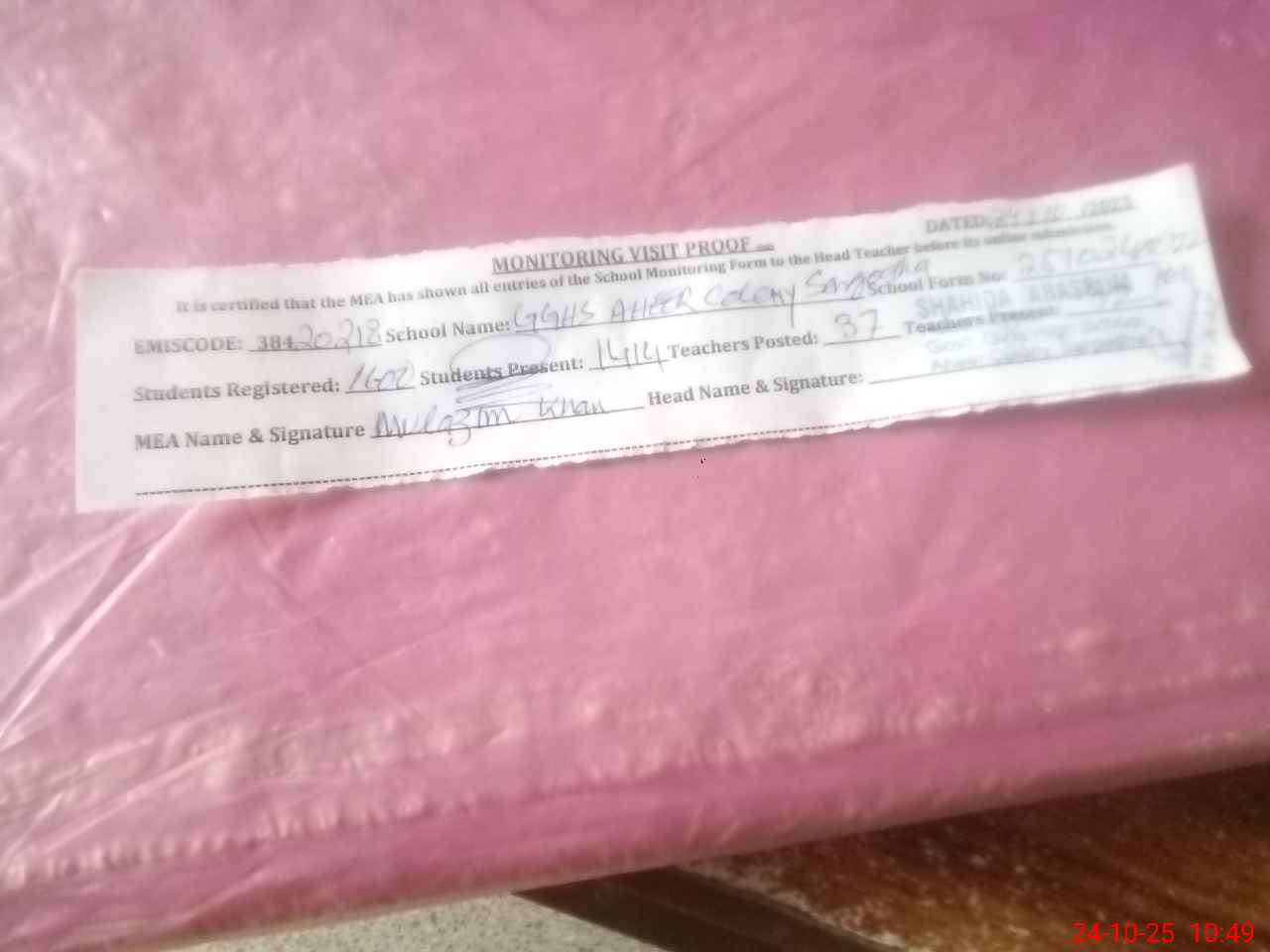 | Certified that this School was Inspected by the Undersigned MEA/DMO Today and the Information Stated Above is as Per Record. | |||||