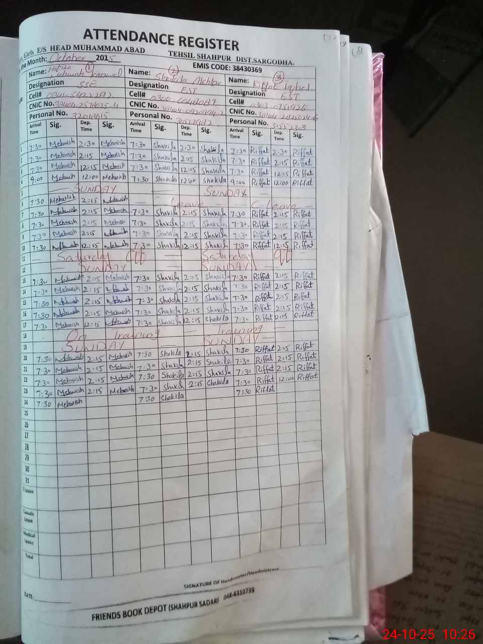 | CNIC | Full Name | Designation | R/C | Absence During Last Calender Month |