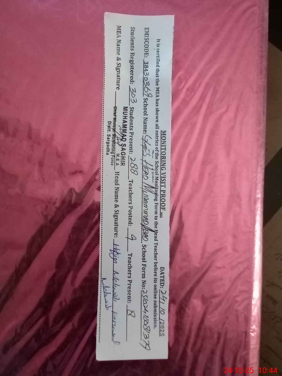 | Certified that this School was Inspected by the Undersigned MEA/DMO Today and the Information Stated Above is as Per Record. | |||||