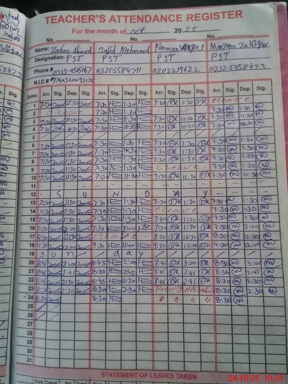 | CNIC | Full Name | Designation | R/C | Absence during last cal. month |