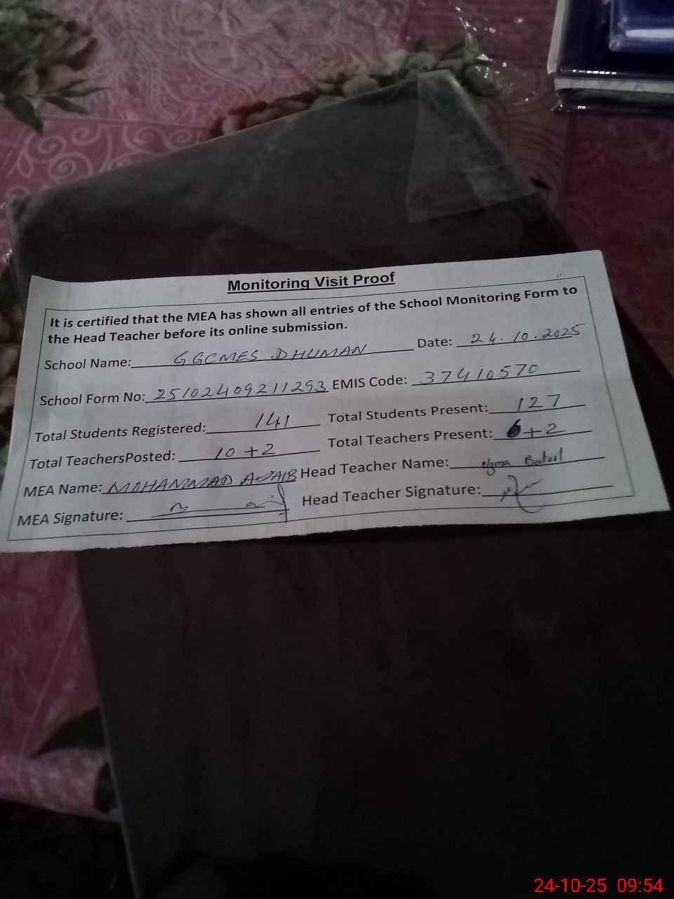 | Attendance Register | Head Teacher | MEA with School | Visit Proof |