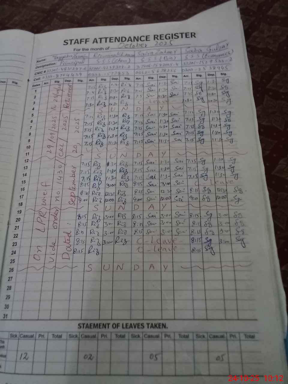 | CNIC | Full Name | Designation | R/C | Absence During Last Calender Month |