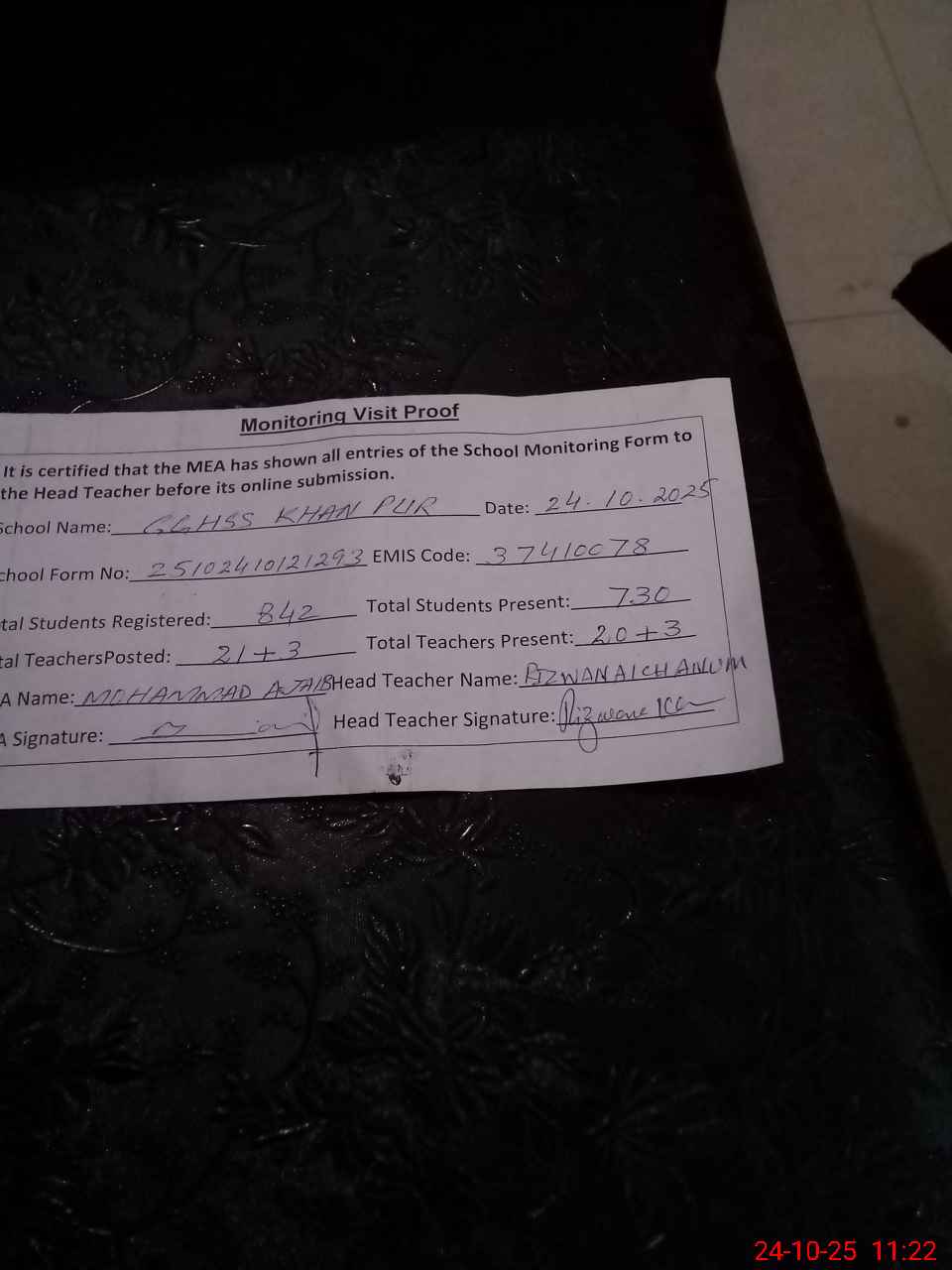 | Attendance Register | Head Teacher | MEA with School | Visit Proof |