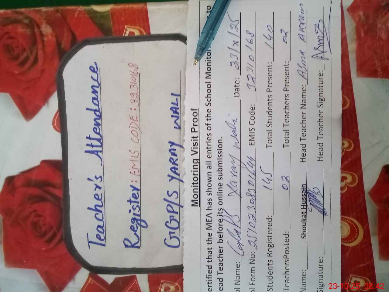 | Attendance Register | Head Teacher | MEA with School | Visit Proof |