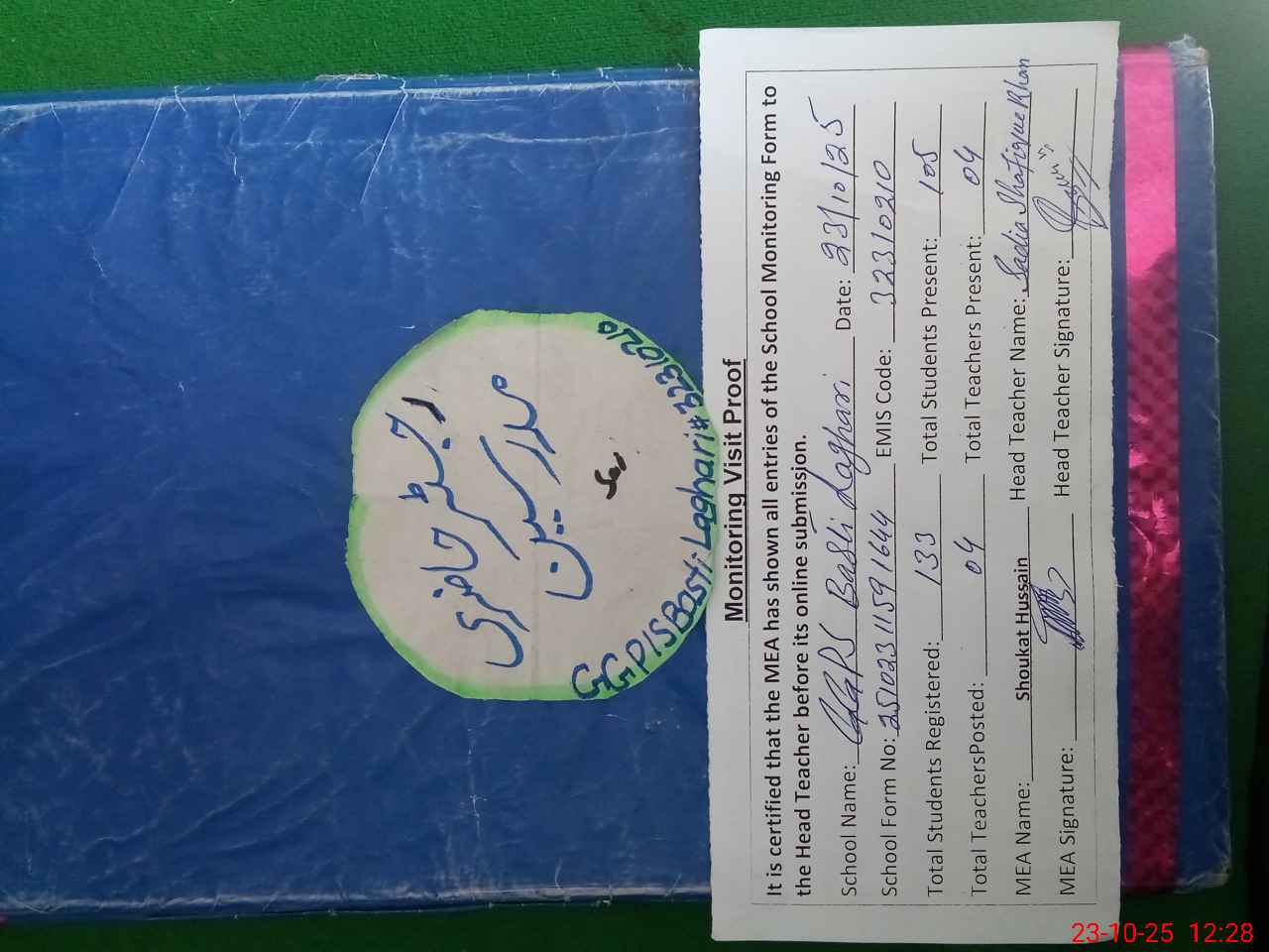 | Attendance Register | Head Teacher | MEA with School | Visit Proof |