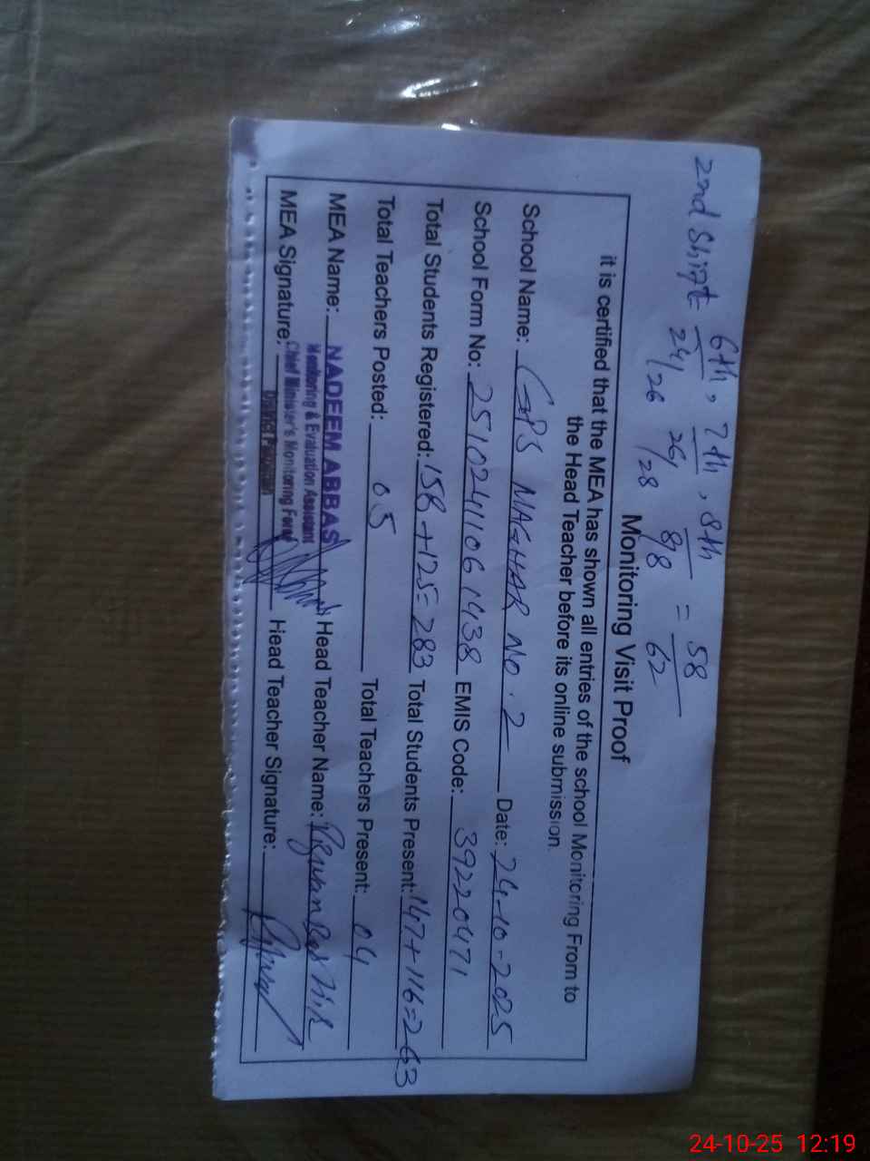 | Certified that this School was Inspected by the Undersigned MEA/DMO Today and the Information Stated Above is as Per Record. | |||||