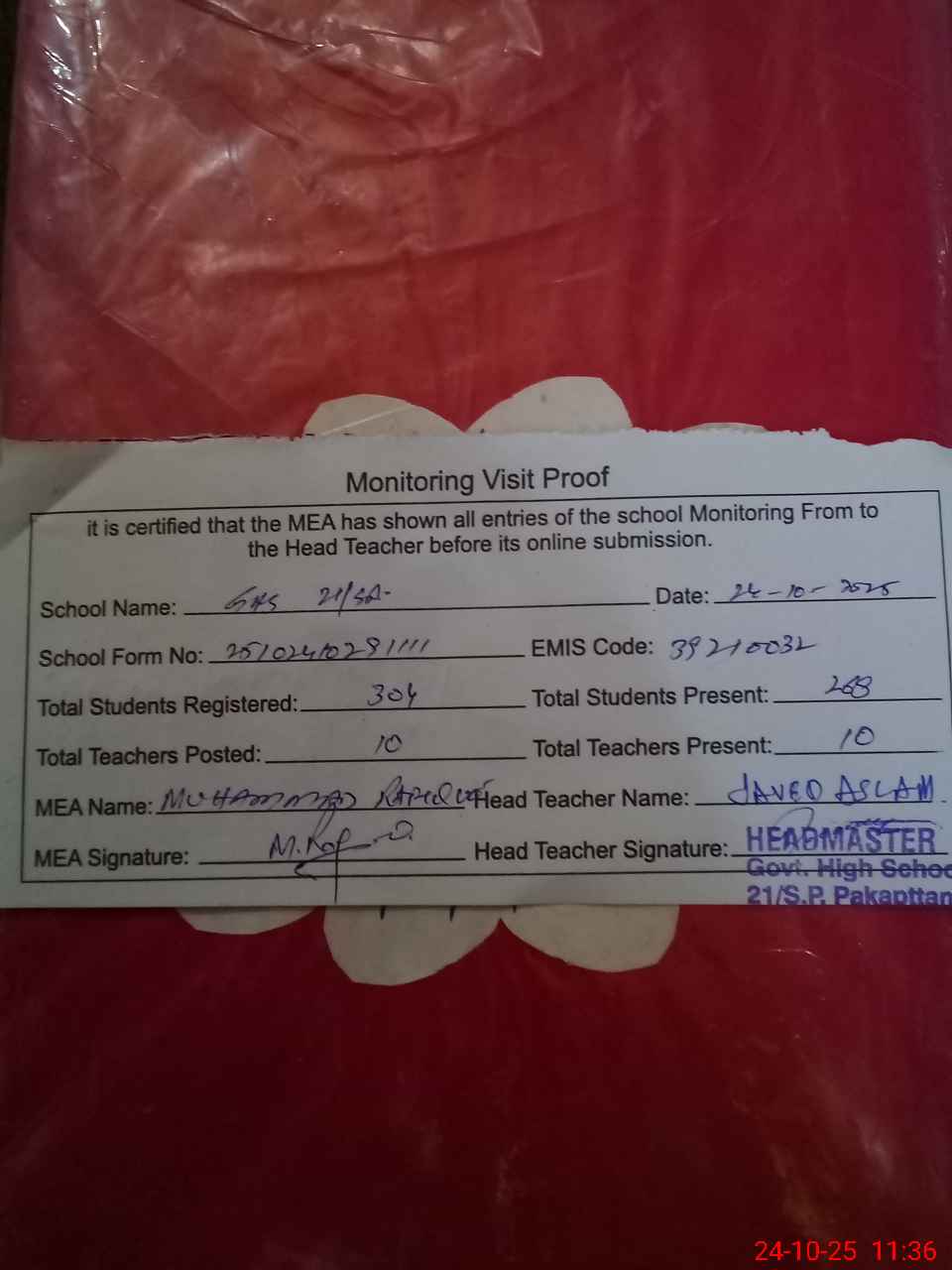 | EMIS Code: 39210032 | Name of School: GHS CHAK NO. 21/SP | |||