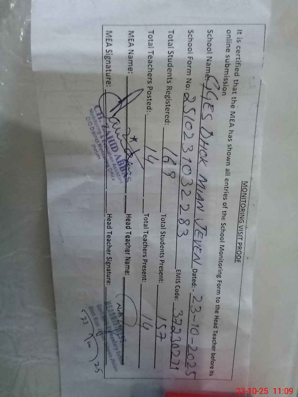 | Monitoring Date: 23-10-2025 | Start Time: 23-10-2025 10:32 AM | End Time: 23-10-2025 11:09 AM | Name of MEA: Za**** Ab**** | |