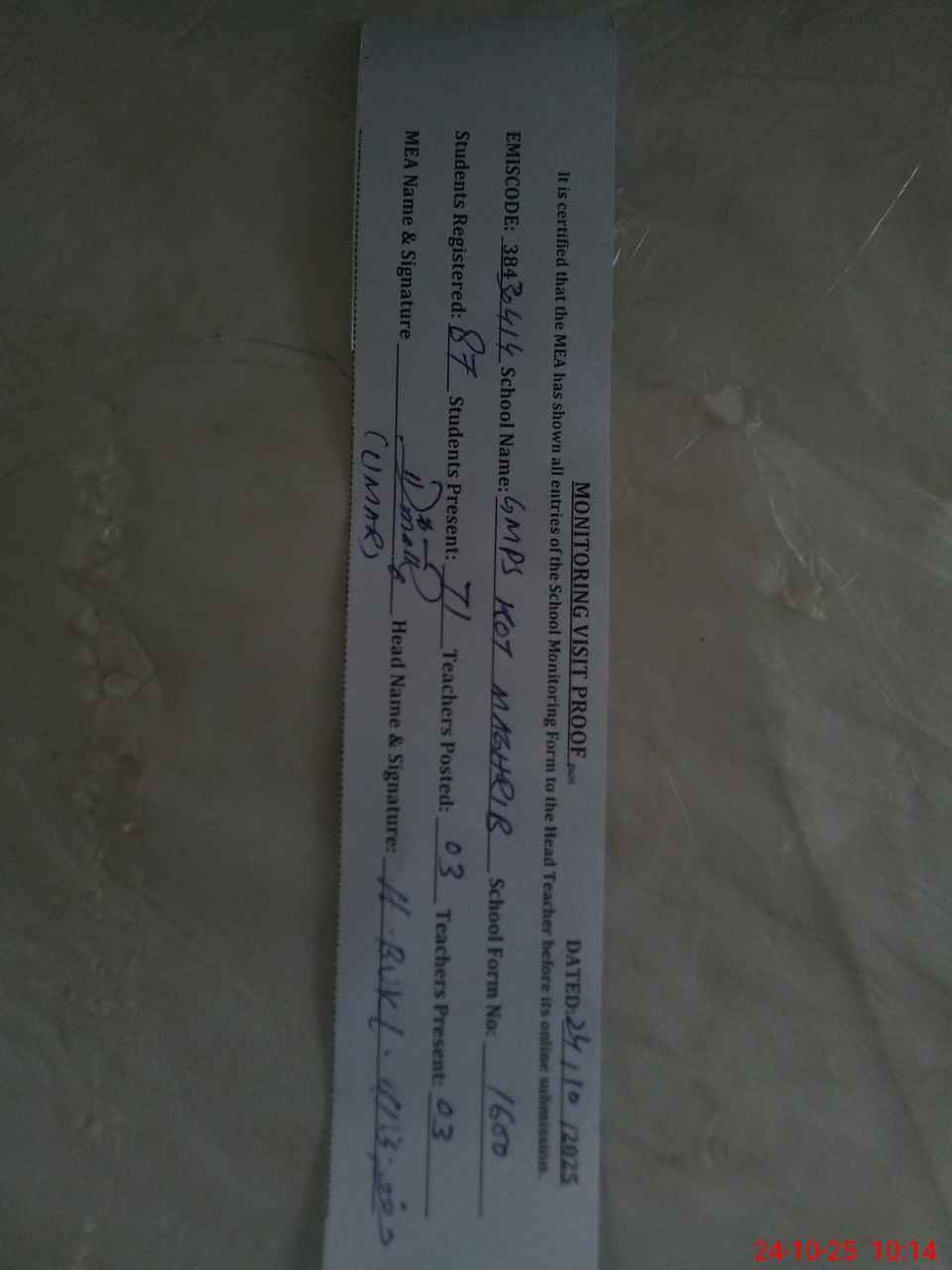 | Attendance Register | Head Teacher | MEA with School | Visit Proof |