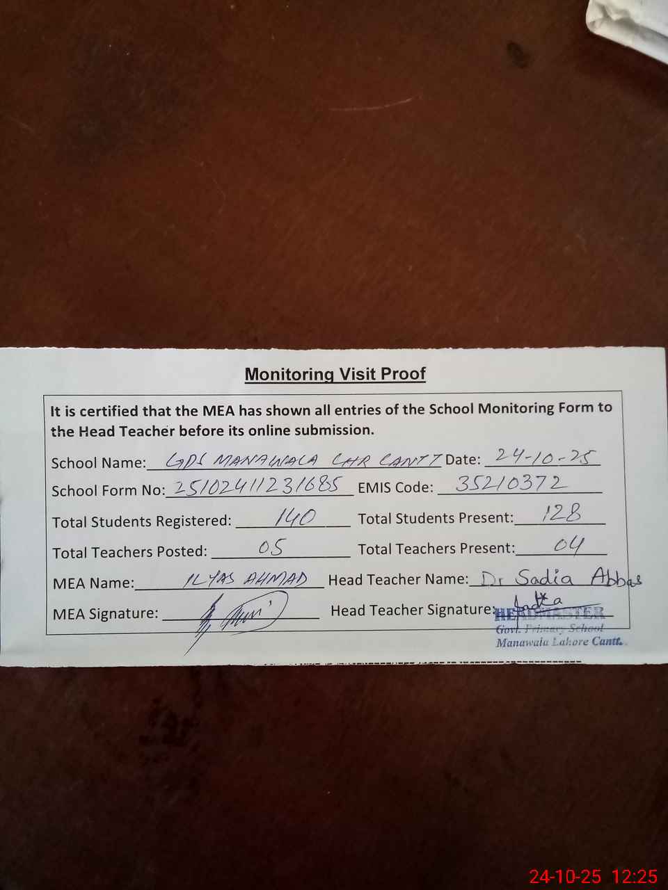 | Attendance Register | Head Teacher | MEA with School | Visit Proof |