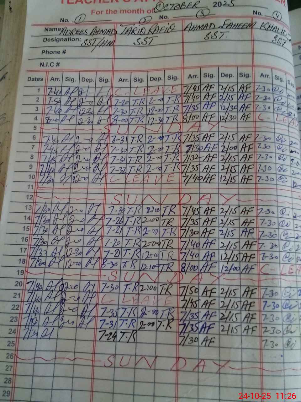| CNIC | Full Name | Designation | R/C | Absence during last cal. month |