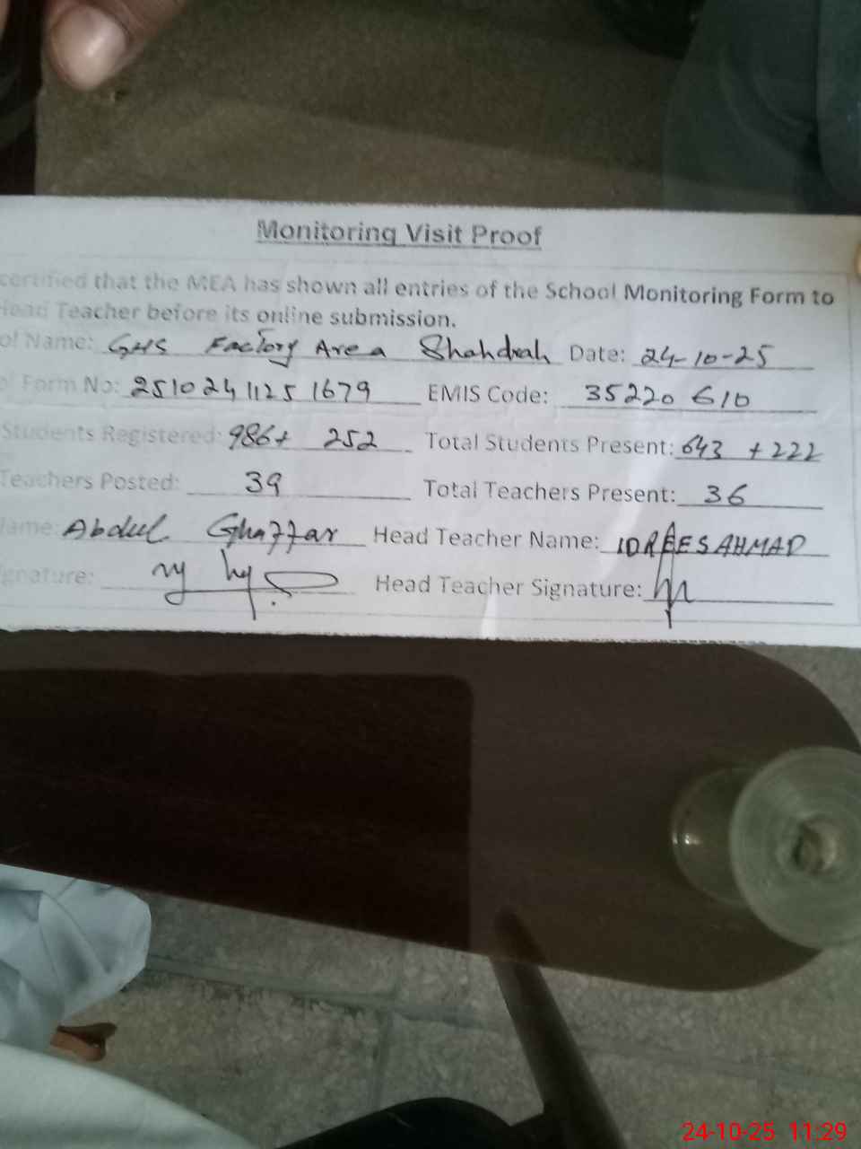 | Remarks (Use Separate Page if Required): Teacher Syed moazam Hussain pst on line leave not applied so marked absent Sweaper jashaid Masih found long absent since August 2024 Students head count found variation 210 Morning present on attendence register 853 but 643 by head count 35220610 Ghs factory area shahdrah 24 Oct 2025 | |||||