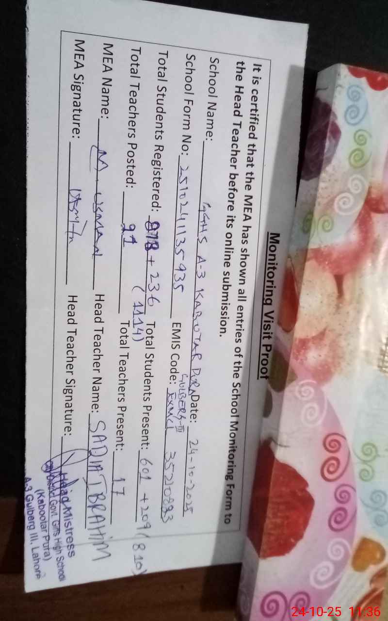 | EMIS Code: 35210823 | Name of School: GGHS A/3 KABUTAR PURA GULBERG III (EX-MCL) | |||