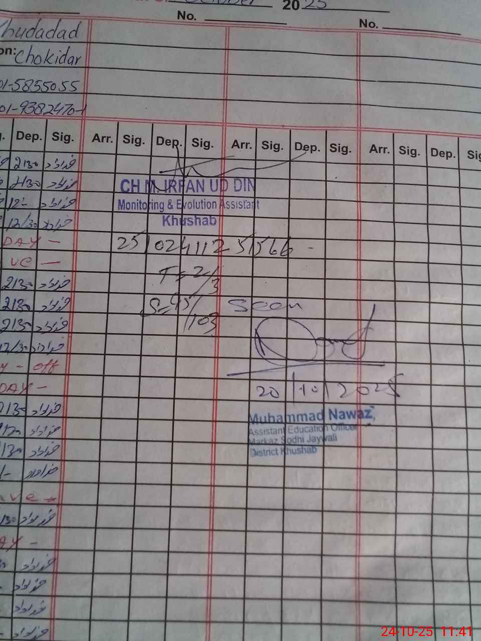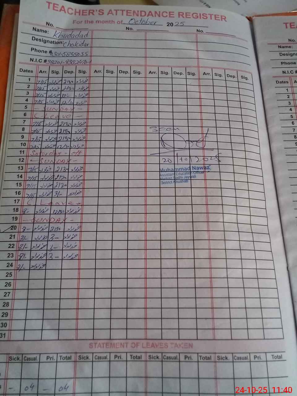 | CNIC | Full Name | Designation | R/C | Absence during last cal. month |