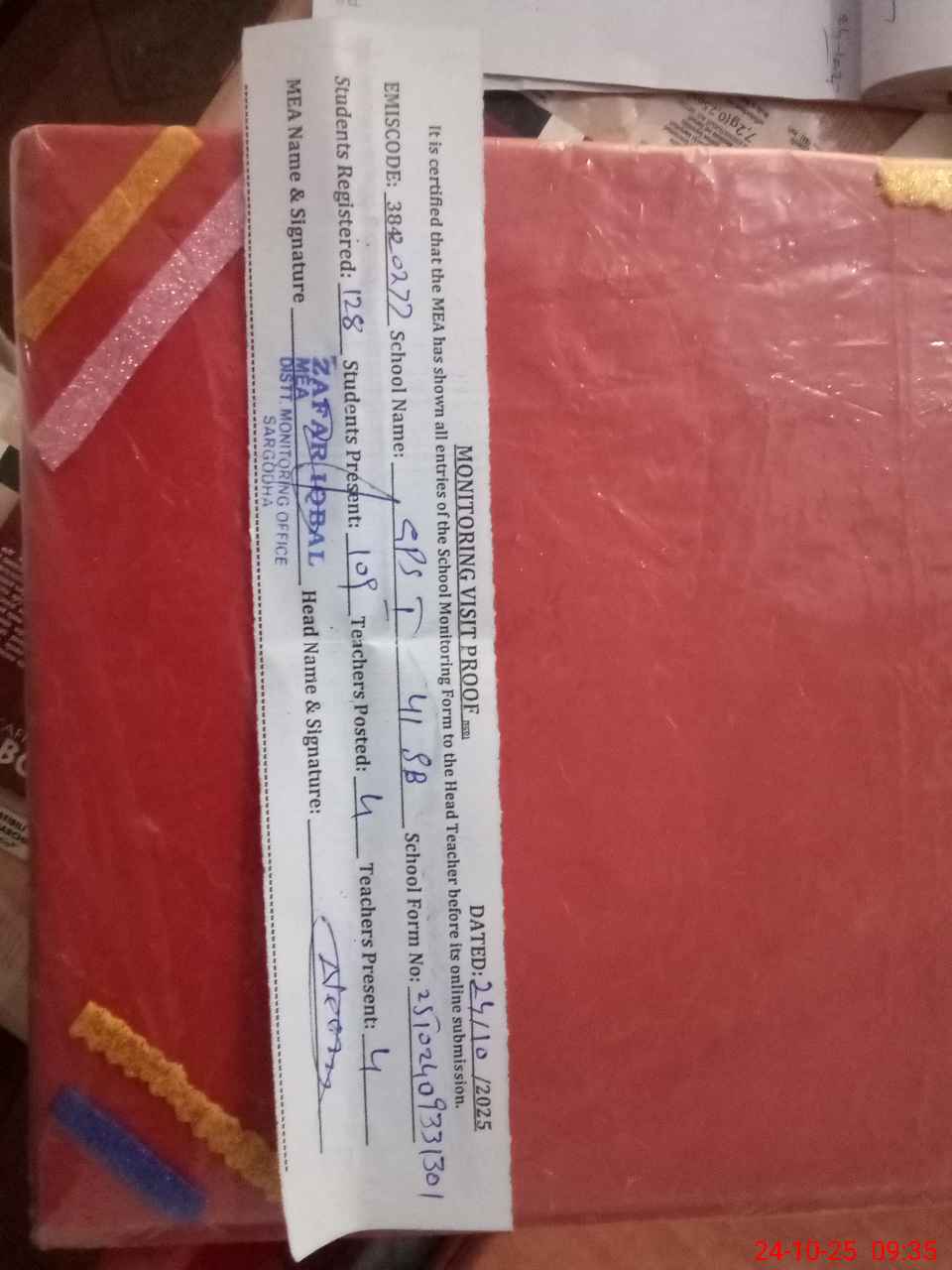 | Attendance Register | Head Teacher | MEA with School | Visit Proof |