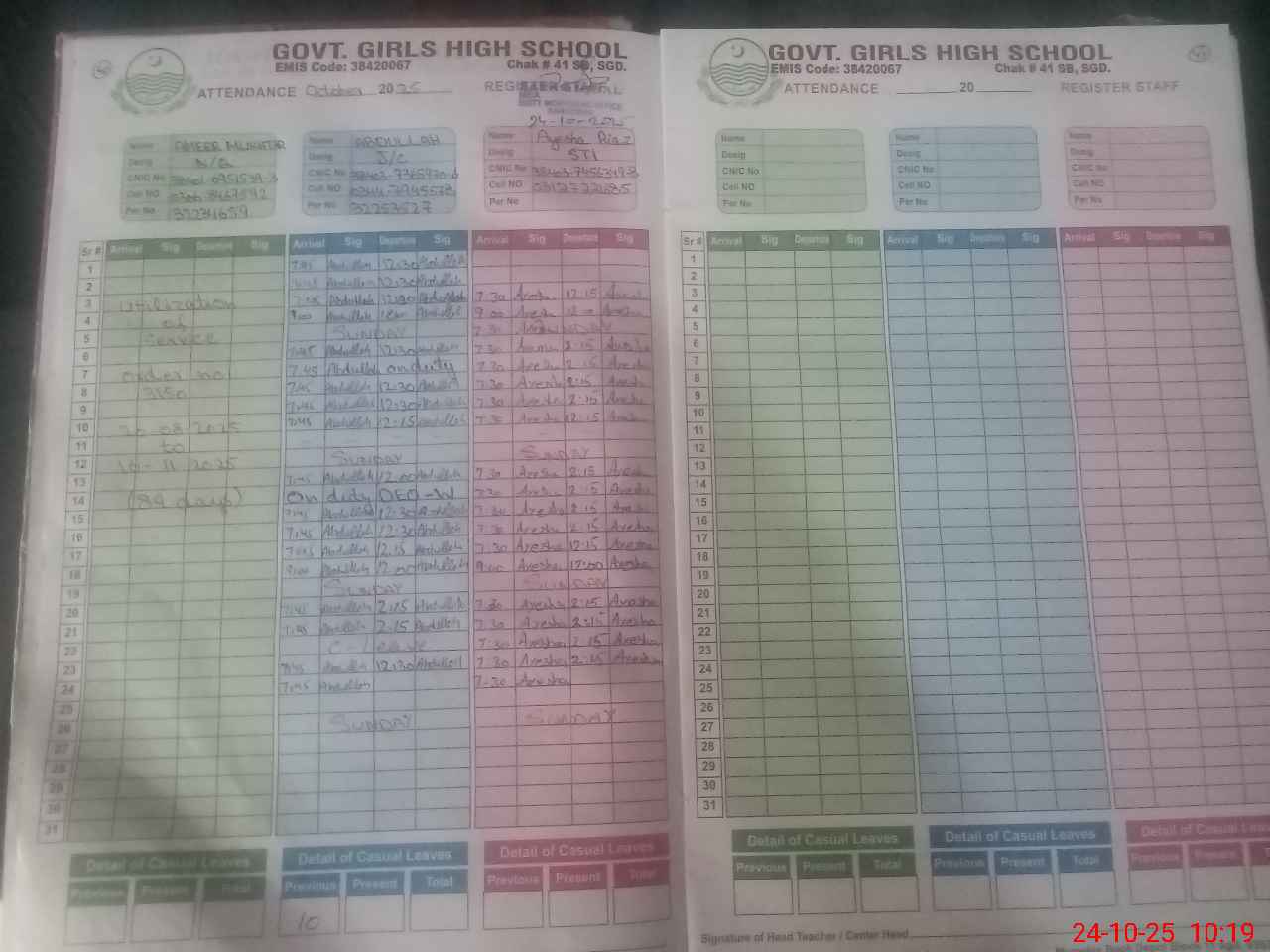 | CNIC | Full Name | Designation | R/C | Absence During Last Calender Month |
