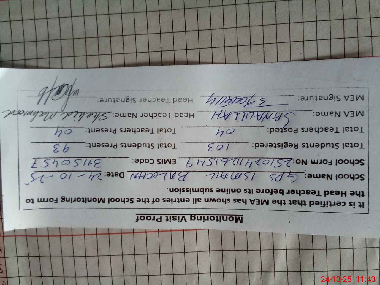 | Attendance Register | Head Teacher | MEA with School | Visit Proof |